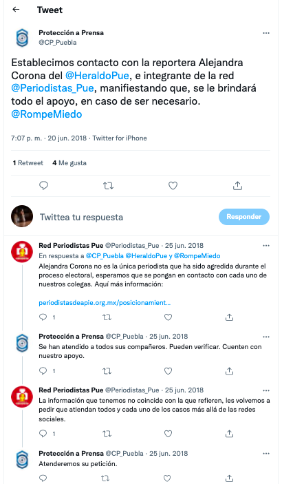 Este aparente abandono del trabajo de la Comisión es evidente también en sus redes sociales, su cuenta de Twitter @CP_Puebla empezó a funcionar en agosto del 2017, pero su última actividad fue en marzo del 2021. En Twitter, además, era el lugar en el que daba “atención” a los casos que se reportaban.